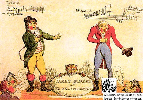 Jew and Gentile, may refer to the depiction of the two famous figures in the print. On the right, is a caricature of a Jew, recognizable as John Braham (considered the greatest tenor of his age) and on the left, a gentile.... The Jew's singing is characterized by a musical notation marked Allegro Squekando and his supporters, two bearded figures to the bottom right, show their appreciation, one of them remarking Mine Cod, How he shing. He appears exhausted at the physical effort of sustaining his note and is hunched forward. By contrast, the gentile is singing Moderato con expressione and the ease of his performance is encouraged by the encores of his English supporters. The print is a graphic representation of some of the tensions between Jew and gentile in a period when political emancipation was beginning to enter the agenda.