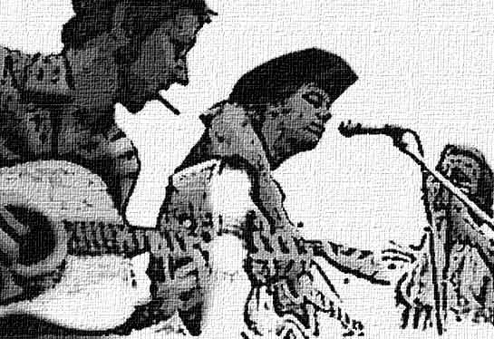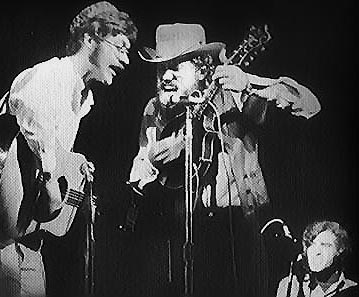 Way back in 1969, I heard his Driftin' Way of Life album featured on Penn's WXPN as I tried doing-"anything-but studying" for the Pennsylvania Bar exam. That album -- actually his first few -- were largely acoustic, with the exquisite aid of the magical picker, David Bromberg (pictured in foreground of the accompanying "drawing "). Unlike many albums that followed in the next few decades, the music and lyrics were all Jerry Jeff's, and almost all delicate, sensitive compositions. My early favorite is the long-lost Fading Lady, which reminded me somehow of classical music, from whence I came at this stage of my listening.
