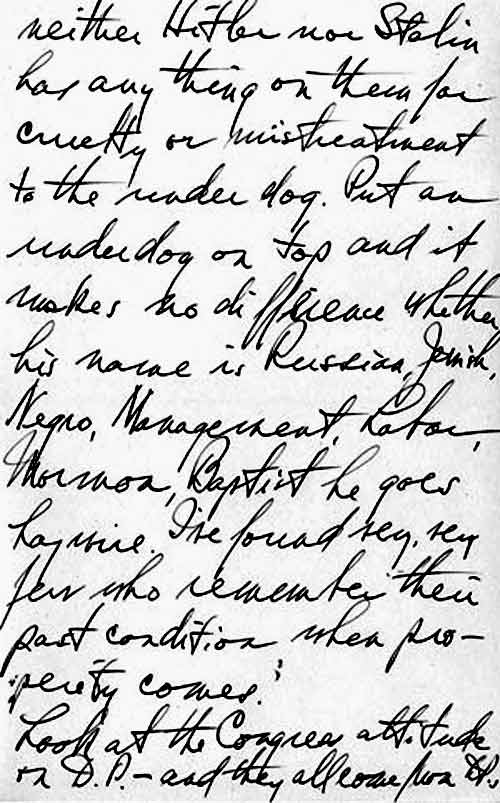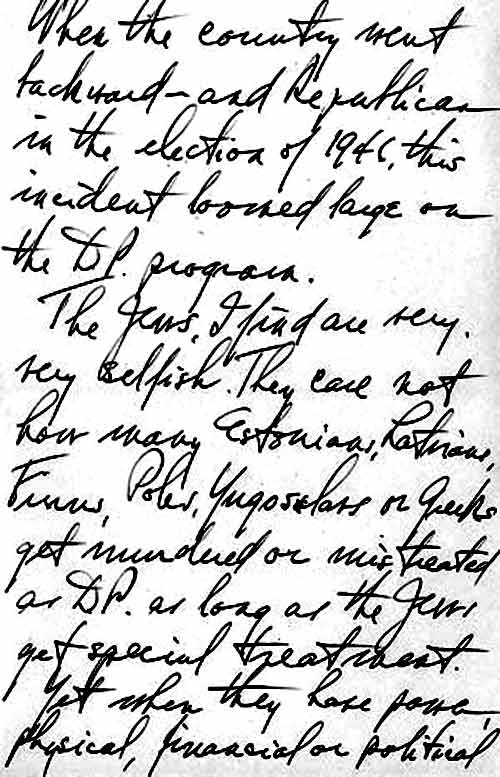 The Jews, I find are very, very selfish. They care not how many Estonians, Latvians, Finns, Poles, Yugoslavs or Greeks get murdered or mistreated as D[isplaced] P[ersons] as long as the Jews get special treatment. Yet when they have power, physical, financial or political neither Hitler nor Stalin has anything on them for cruelty or mistreatment to the under dog."